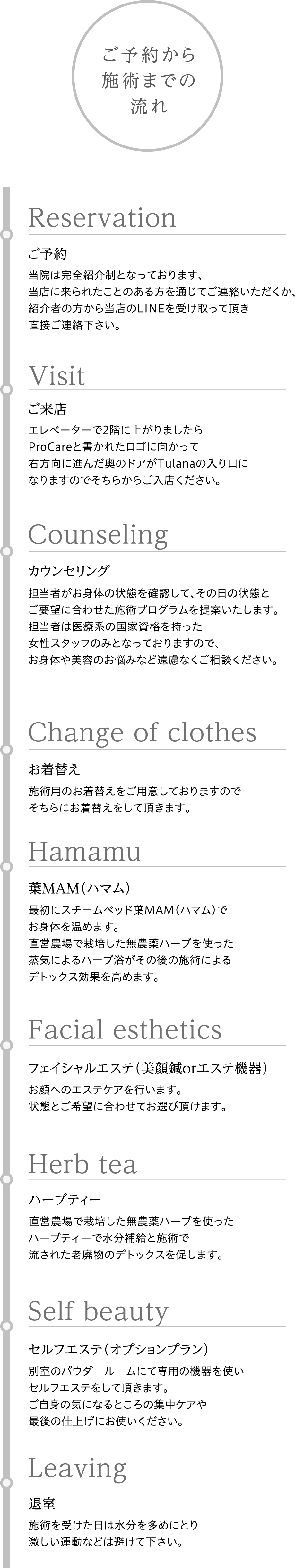 従来のエステでは実現できなかった、 女性ホルモン、腸内環境、リンパの排泄、この3つを整えることに特化した施術は、今までにない「内側から健康に美しくなる」というTulanaのコンセプトを実感して頂けます。